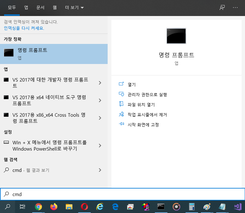 먼저,명령 프롬프트(CMD)를 열어줍니다. 윈도우 내장 검색창에 cmd를 검색하시면 열 수 있습니다.