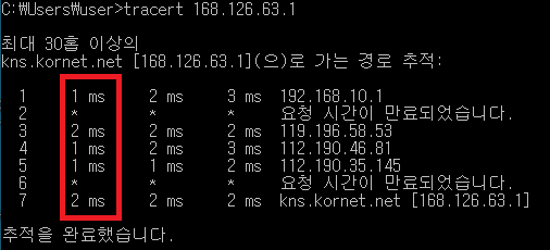 tracert 명령어를 이용하면, 통신 경로상 거치는 라우터(* 통신의 중간 매개장치)와 통신시간이 나타나게 됩니다.