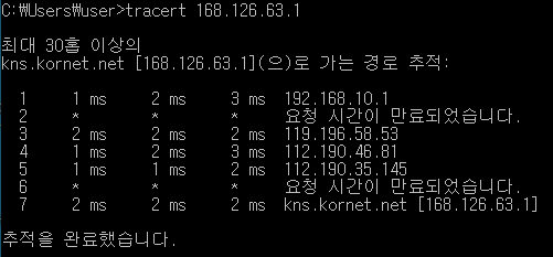 아래는 한국의 통신사 DNS별 주소입니다. 위의 tracert 명령어를 이용해 테스트 해보실 수 있습니다.